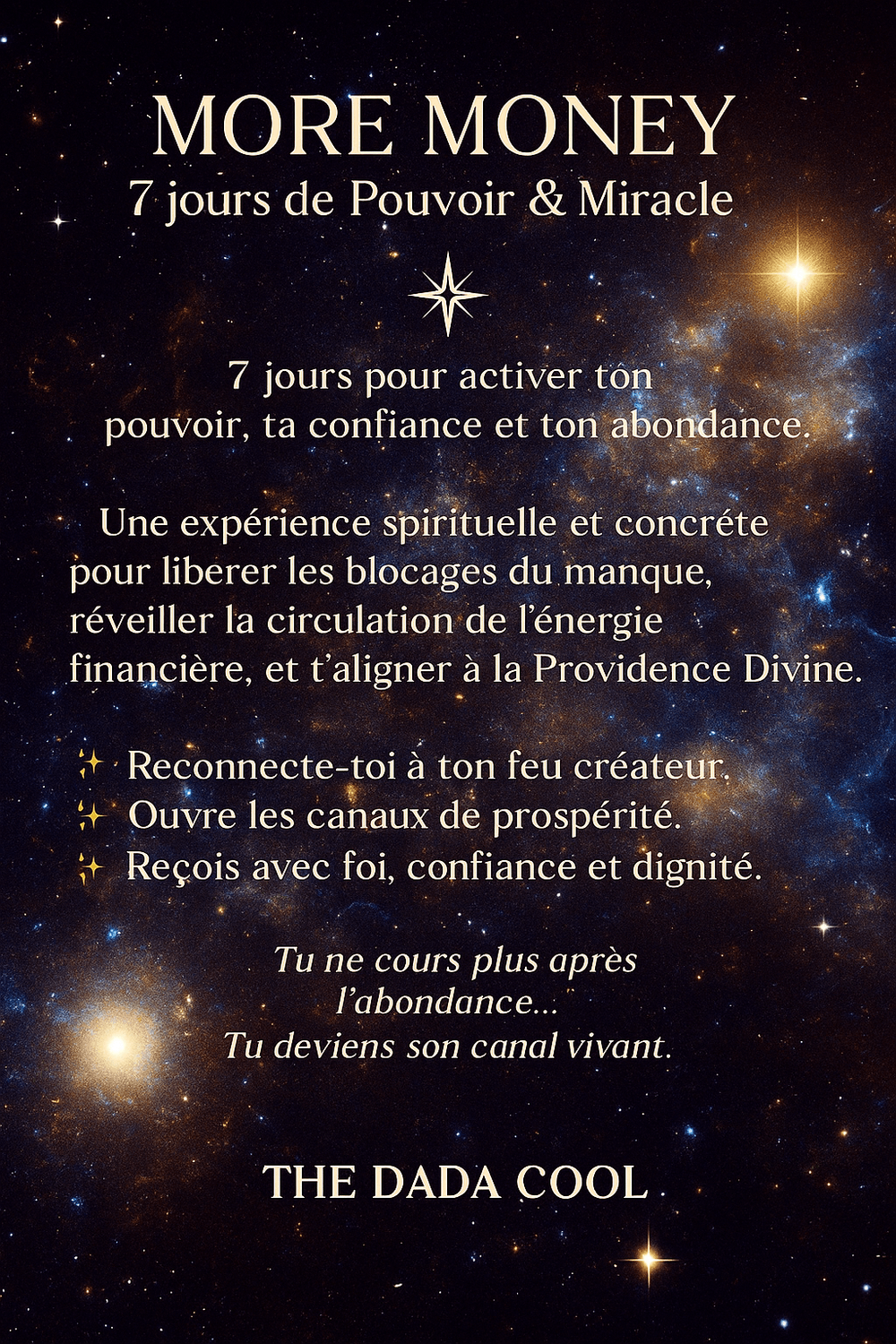 C’est un réalignement intégral entre ton Âme, ton Corps et ton Champ vibratoire, afin que l’argent redevienne un flux sacré, fluide, naturel et cohérent avec ta mission divine.